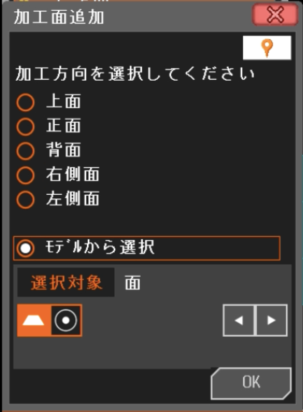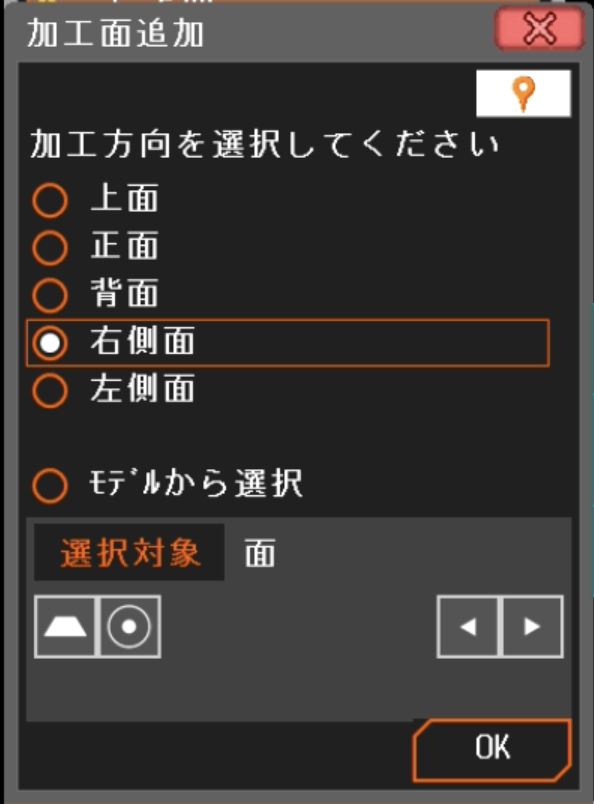 例えば「サイコロの”3″の目がある面」を加工したい場合、「追加」ボタンから「右側面」を選択します。